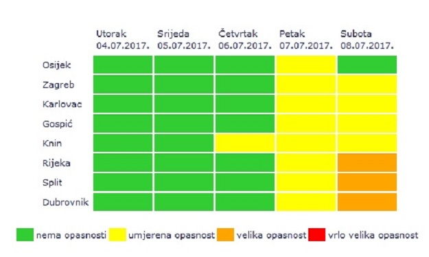 Za vikend koji je pred nama DHMZ je izdao upozorenje za novi toplinski val diljem zemlje. Za veći dio zemlje na snazi je žuti alarm za umjerenu opasnost, dok je za područje Rijeke, Splita i Dubrovnika na snazi narančasti alarm. Vrhunac toplinskog vala očekuje se u nedjelju, kada će temperature prelaziti 35 Celzijevih stupnjeva.