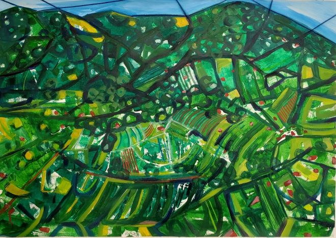 – Moje slike su uvijek prvo crtež kojim sama sebi objašnjavam što želim prikazati, a kasnije krećem s nanošenjem lazurnih tonova te ako slikam na platnu sliku gradim pastama koje sama radim od kvarcnog pijeska, raznih materijala, papira i sl. kako bih dobila reljef. U taj reljefni dio interveniram s drvenim štapićima i špahtlama kako bih dobila razne strukture kojima želim naglasiti pokret, mišiće, kretanje tijela, nagib dijela pejzaža ili što već slikam. Koristim i metalne folije kojima označavam igru svijetlosti i na taj način pri kretanju ispred slike događaju se razne refleksije, nešto poput zamućenog ogledala. Kada se svi ti slojevi osuše krećem s crtanjem, najčešće tvrdim kredama kojima još više definiram nacrtano i na neki način stavljam okvire na plohe te time kroz kiparsko razmišljanje stvaram završni dio kombiniranjem i slaganjem ploha koje omeđuje crtež – opisala je proces nastanka svojih likovnih djela naša poznata slikarica.