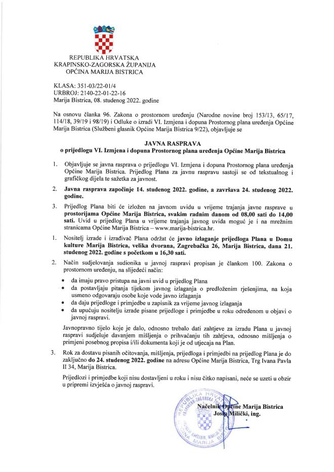 U Mariji Bistrici su objavljene dvije Javne rasprave vezane uz prostorno uređenje. Tako je objavljena Javna rasprava o prijedlogu V. Izmjena i dopuna Urbanističkog plana uređenja središnjeg općinskog naselja Marija Bistrica (UPU Marija Bistrica 1), ali i Javna rasprava o prijedlogu VI. Izmjena i dopuna Prostornog plana uređenja Općine Marija Bistrica (PPU Marija Bistrica). Obje rasprave traju od 14. do 24. studenoga, i za to su vrijeme oba Prijedloga planova izložena javnom uvidu u prostorijama Općine Marija Bistrica, svakim radnim danom od 08,00 sati do 14,00 sati, kao i na mrežnim stranicama Općine Marija Bistrica. Nositelj izrade i izrađivač Plana održat će javno izlaganje prijedlozima planova u Domu kulture u Mariji Bistrici u ponedjeljak 21. studenoga, za Izmjene i dopuna Prostornog plana uređenja Općine Marija Bistrica u 16.30 sati, a za Izmjene i dopune Urbanističkog plana uređenja središnjeg općinskog naselja Marija Bistrica u 18 sati. Rok za dostavu pisanih očitovanja, mišljenja, prijedloga i primjedbi na prijedloge Planova je do zaključno do 24. studenoga na adresu Općine Marija Bistrica, Trg Ivana Pavla II 34, Marija Bistrica. Prijedlozi i primjedbe koji nisu dostavljeni u roku i nisu čitko napisani, neće se uzeti u obzir u pripremi izvješća o javnoj raspravi.