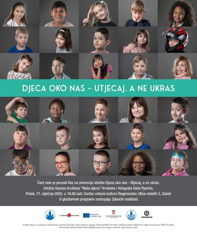 Savez društava „Naša djeca“ Hrvatske organizira svečano otvorenje putujuće izložbe Djeca OKO nas – Utjecaj, a ne ukras, koje će se održati u petak, 17. siječnja 2025. godine u 18:00 sati u Centru urbane kulture Regenerator (Ulica mladih 2, Zabok).