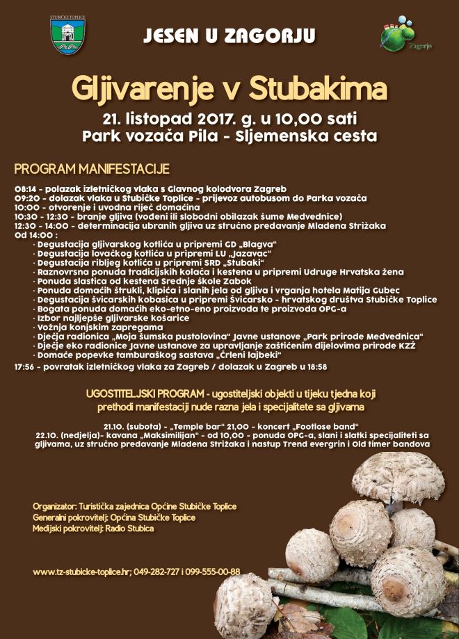 Svi ljubitelji prirode i gljivarenja u subotu će doći na svoje. Naime, Općina Stubičke Toplice u suradnji s Turističkom zajednicom Stubičke Toplice poziva na tradicionalnu 21. jesensku manifestaciju 'Gljivarenje v Stubakima'. Događanje počinje u 10 sati, a od 10:30 do 12:30 je predviđeno branje gljiva (vođeni ili slobodni obilazak šume Medvednice), moći će se čuti stručno predavanje o gljivama, a nezaobilazna je degustacija gljivarskog, lovačkog, ribljeg kotlića u organizaciji GD 'Blagva', LU 'Jazavac' i SRD 'Stubaki'. Udruga Hrvatska žena zadužena je za raznovrsnu ponudu tradicijskih kolača i kestena, hotel Matija Gubec će ponuditi domaće štrukle, klipiće i slana jela od gljiva i vrganja, a Srednja škola Zabok će ponuditi svoje slastice od kestena. Moći će se degustirati švicarske kobasice, a tu je i bogata ponuda eko-etno-eno proizvoda OPG-a.