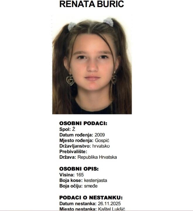 Splitsko-dalmatinska policija traga za maloljetnom osobom Renatom Burić (2009.), koja je nestala 26. studenog 2025. u Kaštel Lukšiću.