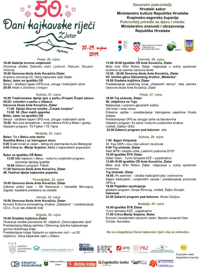 Manifestacija će biti svečano otvorena u petak 20. rujna u OŠ Ante Kovačića Zlatar u 19 sati. Bogat i sadržajan program predstavila je ravnateljica POU dr. Jurja Žerjavića Zlatar Gordana Valjak, koja je rekla da je napravljen program u kojem će se naći ponešto za svakoga, no istaknula je da je Zlatar posebno poznat po dječjim priredbama koje ove godine također slave 50. rođendan. – Priredbe Zbor malih pjesnika i likovna izložba Čovjek čovjeku su i starije od toga, krenule su još početkom 60-ih godina prošlog stoljeća. Treća priredba je Festival dječje kajkavske popevke, jedinstveno događanje, jer su djeca i autori i izvođači skladbi koje slušamo na Festivalu već 48 godina, uz pratnju Tamburaškog orkstera HRT – a. Dječjim priredbama posvećen je prvi vikend, pa će se u subotu 21. rujna održati Zbor malih pjesnika i izložba Čovjek čovjeku. Na ovim priredbama ugošćujemo otprilike 100 škola s kajkavskog govornog područja, dobili smo na Zboru malih pjesnika 311 radova 45 škola, isto toliko škola na izložbi, čak 665 radova, a manji dio toga ćemo slušati i izložiti u školi. Treća priredba Festival dječje kajkavske popevke održat će se u nedjelju 22. rujna – rekla je Gordana Valjak, dodavši kako se dio manifestacije posvećen djeci nastavlja i u Belcu. Kroz tjedan, posjetitelje očekuje niz kulturnih događanja, kazališnih predstava, likovnih izložbi, promocija knjiga, koncerata. Izdvojimo koncert KPD – a Zlatarjeve u utorak 24. rujna, jer društvo također bilježi 50 godina djelovanja i jedan je od osnivača Dana kajkavskih riječi,gdje će predstaviti svoj prvi CD 'To je naš zlatarski kraj'. – Tu je i predstavljanje Malog riječnika i Slikovnog riječnika kajkavskog govora stubičkog kraja, kao i predstavljanje knjige 'Najlepše su kajkavske riječi'.