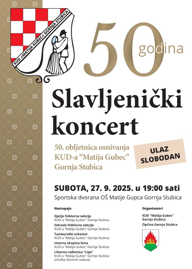 U subotu 27.9.2025. u 19.00 h održat će se koncert povodom 50. obljetnice osnivanja KUD-a "Matije Gupca" u Gornjoj Stubici.