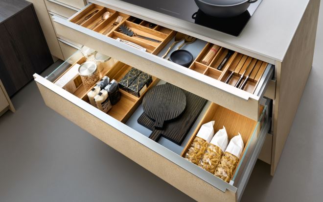 Kako bi ladice bile funkcionalne možete ih organizirati različitim pregradama, ulošcima, organizatorima, košarama i kantama za odvajanje otpada. Ovakvi sustavi za organizaciju osmišljeni su kako bi svojim dimenzijama odgovarali sustavima ladica i prilagodili se individualnim navikama i željama. Organizirane ladice omogućit će da pregledno vidite sve što ste u njih spremili, a izvlačni ormari ne zauzimaju puno mjesta i lako možete pristupiti stvarima koje ste u njih spremili. Izvlačne ormare postavite blizu ploče za kuhanje i mjesta za pripremanje hrane kako bi vam svi dodaci bili nadohvat ruke.