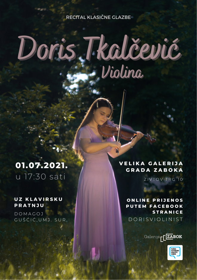 Pučko otvoreno učilište Zabok organizira koncert Doris Tkalčević na violini, uz klavirsku pratnju Domagoja Gušćića. Koncert će se održati u Velikoj galeriji grada Zaboka u četvrtak 1. srpnja u 17.30 sati.