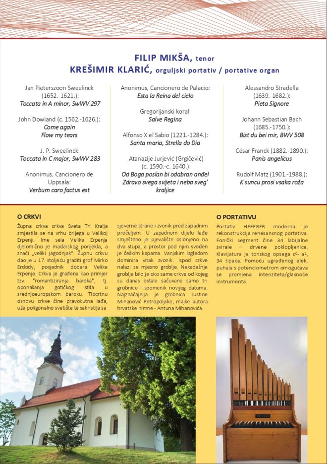Na koncertu će nastupiti renomirani mladi glazbenici; Krešimir Klarić na orguljskom portativu i tenor Filip Mikša. Ulaz na koncert je besplatan.