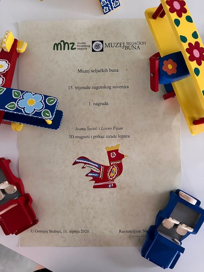 – Nismo se ni snašli u cijeloj toj priči. Samo se sve zakotrljalo. Muzeju Kumrovec bilo je jako zanimljivo da smo mi tako mladi i zvali su nas na Dan mladosti. Bili su oduševljeni i nakon toga nas pozvali na izložbu u Beograd. S Muzejima Hrvatskog zagorja smo čak išli i u Slovačku na Festival Dunava. Nakon toga su nam ponudili i ugovor da budemo njihovi prezentatori tradicijskih igračaka, što nam je bila velika motivacija i priznanje - priča Ivana koja je završila Školu primijenjene umjetnosti, smjer industrijski dizajn. Osim toga, 2020. godine na 15. Trijenalu zagorskih suvenira osvojili su prvu nagradu za svoje 3D magnete i prikaz izrade leptira.
