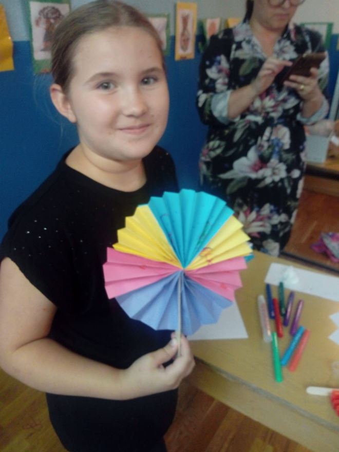 Pripremila ju je voditeljica Ivana Kmetić, a izrađivale su se lepeze od papira i drvenih štapića. Djeca su prionula vještom i spretnom savijanju papira, lijepila, vezala i kreativno ukrašavala svoje lepeze, a volonterke su ih razveselile i voćnim poslasticama.