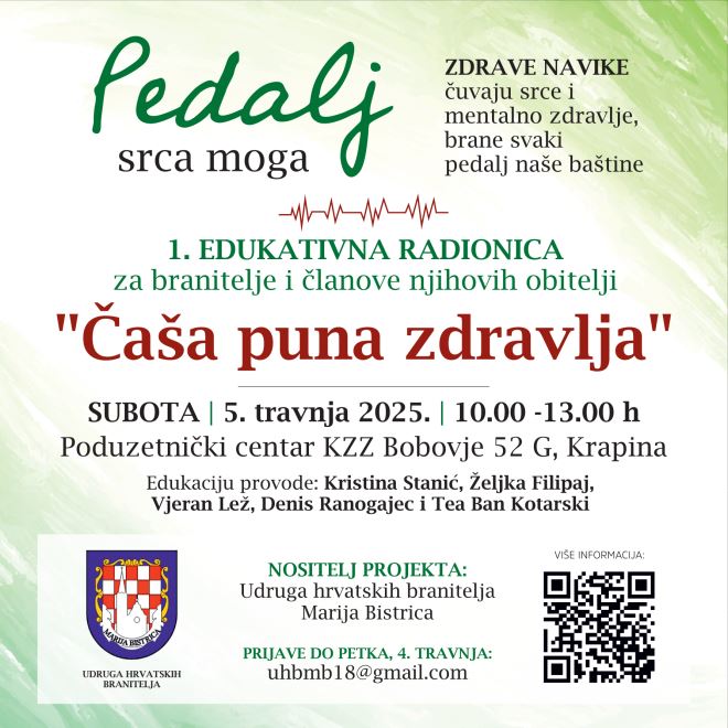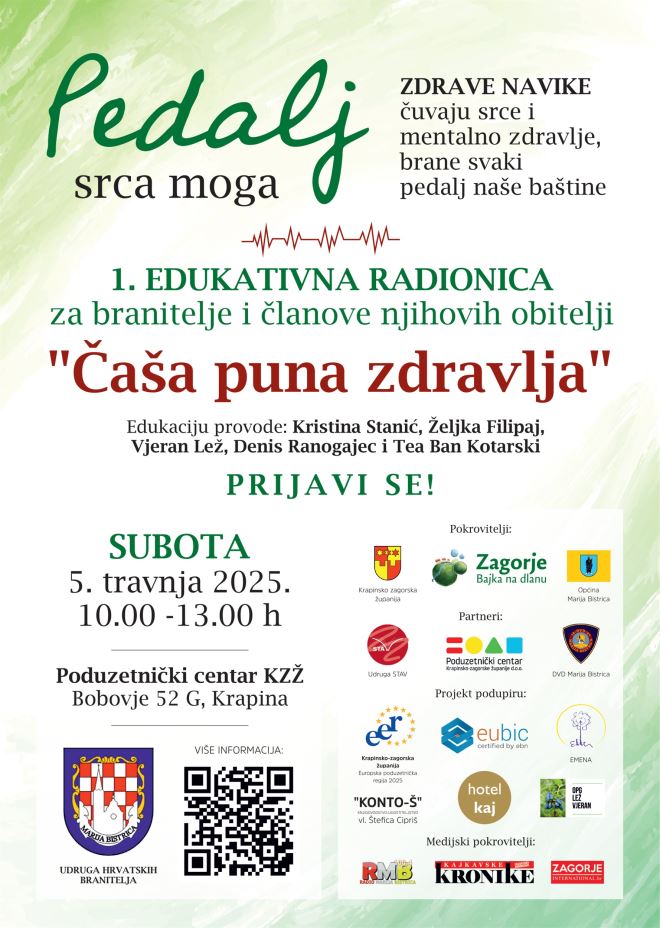 Sutra (subota), uoči Svjetskog dana zdravlja, s početkom u 10.00 sati, u Poduzetničkom centru KZŽ, u Krapini, u sklopu projekta „PEDALJ SRCA MOGA", u organizaciji Udruge hrvatskih branitelja Marija Bistrica, održat će se prva od ukupno šest edukativnih radionica pod nazivom ČAŠA PUNA ZDRAVLJA.
