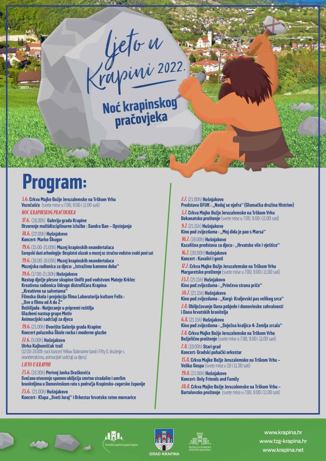 U subotu 17. lipnja u 19.30 sati u Galeriji grada Krapine bit će otvorena izložba 'Opstojanja' Sandre Ban. Idućeg dana na Hušnjakovom koncert će održati Marko Škugor, a 19. lipnja od 15 do 21 sat u Muzeju krapinskih nenadertalaca održat će se Europski dani arheologije uz besplatni ulazak u muzej i stručno vodstvo svaki puni sat. Također, muzejska radionica za djecu 'Istražimo kameno doba' trajat će istog dana od 16 do 18 sati. Od 17 sati bit će živo na Hušnjakovom. Organizatori su pripremili nastup dječje plesne skupine Unifit pod vodstvom Mateje Krklec, kreativnu radionicu Udruge distrofičara Krapina Kreativno sa slavetama', filmsku školu i projekciju filma Laboratorija kulture Felix 'Sve o filmu od A do Ž', roštiljadu, odnosno natjecanje u pripremi roštilja, glazbeni nastup grupe Motiv te animacijske sadržaje za djecu. Nedjelja 19. lipnja donosi i Koncert polaznika Škole rocka i moderne glazbe u dvorištu Galerije grada Krapine od 21 sat, a 22. lipnja od 9 sati na Hušnjakovom održat će se utrka Kajbumščak trail. Tu je i popratni sadržaj od 12 sati – rock koncert Yellow Submarine band i Fifty G, druženje s neandertalcima i animacijski sadržaji za djecu.