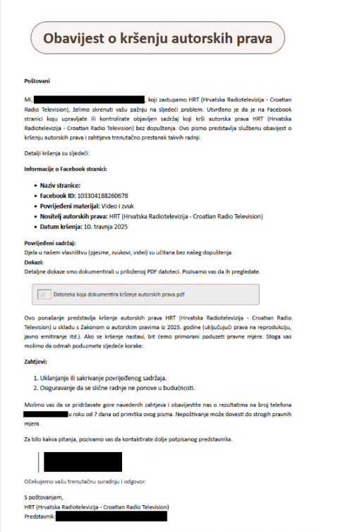 Prvi napad odvija se putem elektroničke pošte, a napadači se predstavljaju kao odvjetničko društvo koje zastupa Hrvatsku radioteleviziju uvjeravajući građane da krše autorska prava HRT-a.