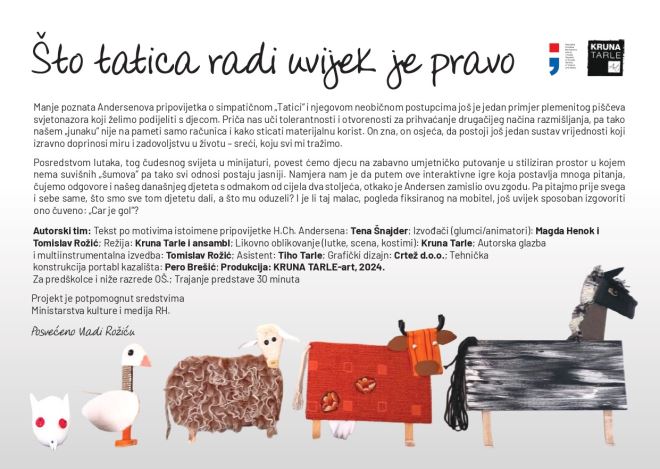 Predstava se temelji se na manje poznatoj Andersenovoj priči o simpatičnom tatici koji odlazi na sajam zamijeniti konja za nešto "korisnije" i namijenjena je predškolcima i učenicima nižih razreda osnovne škole.