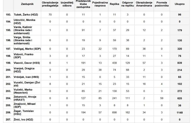 Saborska zastupnica Marija Puh (Stranka rada i solidarnosti) imala je 121 javljanje, dok je saborski zastupnik Žarko Tušek imao je ukupno 96 javljanja. Saborski zastupnik Siniša Hajdaš Dončić imao je 94 javljanja.