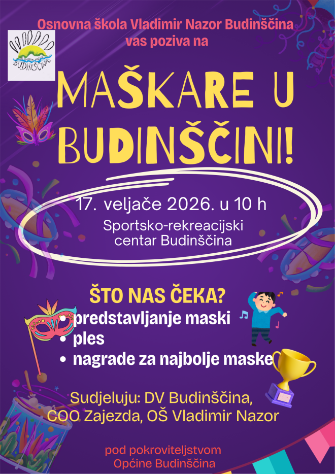 Budinščina će u utorak, 17. veljače 2026. godine, ponovno zasjati u duhu tradicije, veselja i maštovitih maski. Na Sportsko-rekreacijskom centru Budinščina s početkom u 10 sati održat će se obilježavanje fašničkih običaja uz maskiranu povorku i prigodni program, u organizaciji Osnovne škole Vladimir Nazor Budinščina.