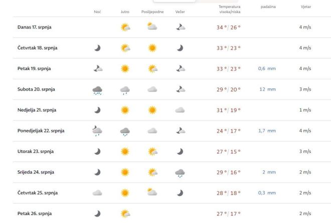 Sutra će biti pretežno sunčano. U unutrašnjosti ponegdje jači razvoj oblaka, moguće i lokalni pljuskovi s grmljavinom, posebno na istoku. Vjetar slab do umjeren sjeveroistočni i sjeverni. Na Jadranu slaba do umjerena bura, podno Velebita i jaka s olujnim udarima, sredinom dana i popodne ponegdje sjeverozapadnjak i jugozapadnjak. Najniža jutarnja temperatura od 17 do 22, na Jadranu između 23 i 28 °C. Najviša dnevna temperatura od 30 do 35 °C, u Dalmaciji malo viša.