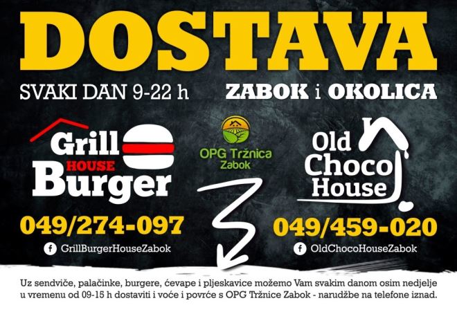 Grill Burger House i Old Choco House dostavljaju svaki dan osim nedjelje od 9 do 22 sata, a 9 do 15 dostavljaju voće i povrće s OPG Tržnice Zabok u Zaboku i okolici. Naručiti možete dan prije na broj 091 602 49 77. Dostava iz Grill Burger House na 049/ 274 - 097, a iz Old Choco House na 049/459 -020.