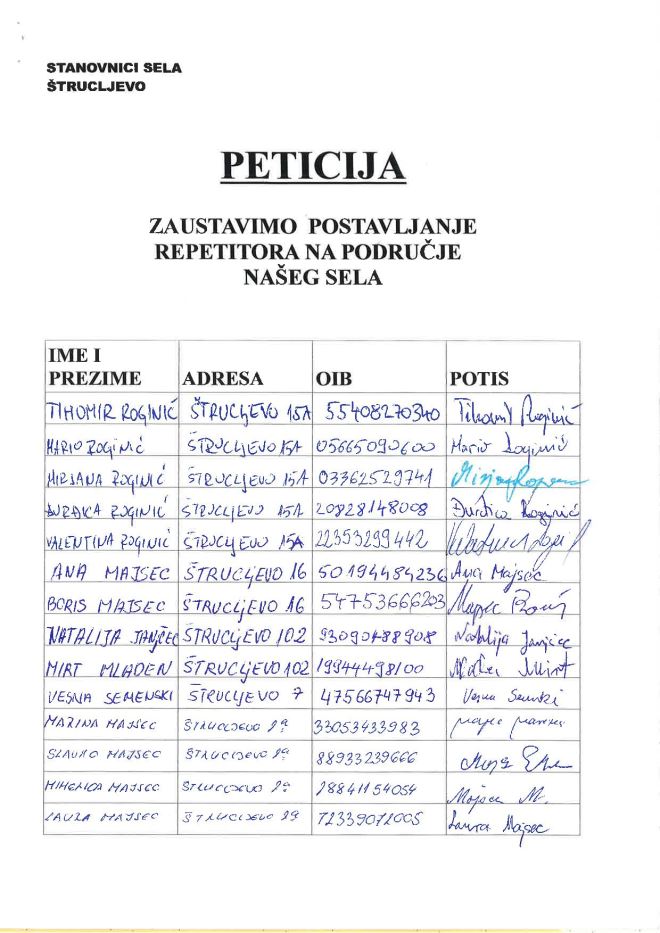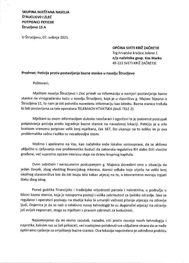 ‘Mještani su ovom informacijom duboko razočarani i ogorčeni, pa ju je u vrlo kratkom vremenu potpisao velik broj mještana, čak 167, što ukazuje na to koliko im je ova problematika važna i koliko su nezadovoljni istom. Molimo i apeliramo na Vas, kao načelnika naše lokalne samouprave, da se aktivno uključite u rješavanje ove problematike budući da zakonska regulativa RH slabo štiti vlastite građane, već suprotno općem interesu staje na stranu krupnog kapitala, kaže se u peticiji i dodaje da su dovedeni u situaciju da zbog interesa jednog čovjeka, vlasnika parcele donose odluke koje utječu na veliki broj okolnog stanovništva bez da isti imaju bilo kakav utjecaj na to, a istovremeno moraju trpjeti štetu zbog istog, kaže se u peticiji i upozorava da bi time bila obezvrijeđene tamošnje parcele i nekretnine, a bazna stanica je opasna i za ljudsko zdravlje usprkos činjenici da se teleoperateri pozivaju na studije, ovdje se radi o relativno novoj tehnologiji te su dugoročni utjecaji na zdravlje još uvijek nepoznati pa su mještani s pravom zabrinuti za budućnost. Napominju i da nisu protiv novih tehnologija i napretka pa apeliraju da se pronađe primjerenija lokacija jer je ova preblizu naselja i stambenih objekata, može narušiti cijelu vizuru naselja i potencijalno ugroziti zdravlje tamošnjih ljudi. U naseljima Štrucljevo i Zleć rođen je velik broj djece i potpisnici peticije apeliraju na načelnka Marka Kosa za maksimalan angažman kako bi svi zajedno našli prihvatljivo rješenje za ovu situaciju.