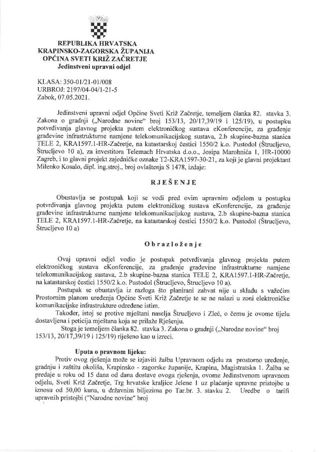 Općina Sveti Križ Začretje reagirala je i izdala Rješenje kojim se obustavlja postupak izdavanja potvrde glavnog projekta, a koji se vodi pred ovim upravnim odjelom u postupku potvrđivanja glavnog projekta putem elektroničkog sustava eKonferencije, za građenje građevine infrastrukturne namjene telekomunikacijskog sustava, 2.b skupine-bazna stanica. U obrazloženju stoji da se izdavanje potvrde glavnog projekta obustavlja iz razloga što planirani zahvat nije u skladu s važećim Prostornim planom uređenja Općine Sveti Križ Začretje te se ne nalazi u zoni elektroničke komunikacijske infrastrukture određene istim. Također, istoj se protive mještani naselja Štrucljevo i Zleć, o čemu je ovome tijelu dostavljena i peticija mještana.