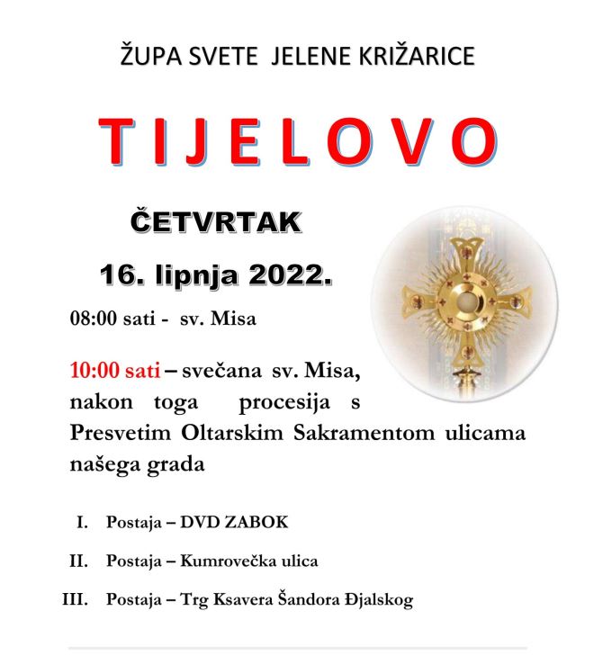 Ove godine po prvi puta ćemo organizirati Tijelovsku procesiju ulicama našega grada. Nakon svete mise u 10 sati poći ćemo od župne crkve prema centru grada Zaboka. Prva postaja bit će kod Dvd-a Zabok, druga kod Kumrovečke ulice a treća na Trgu Ksavera Šandora Gjalskog gdje će biti i završni Blagoslov s Presvetim Sakramentom.