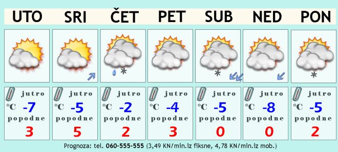 I u srijedu će jutro biti hladno s temperaturom od -7 do -3°C. Dosta oblaka, ali su moguća i kraća sunčana razdoblja. Tu i tamo može naletjeti koja pahulja snijega. Vjetar i dalje uglavnom slab, a najviša popodnevna temperatura između 3 i 5 Celzijevih stupnjeva.