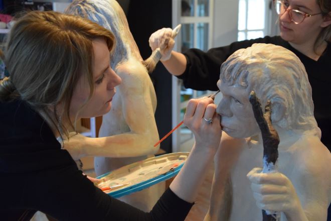 Od kraja 80-tih su postepeno, kroz vrijeme, sve skulpture odlijane u bronci. Prve brončane skulpture bile su one koje prikazuju neandertalce te su postavljene na istom mjestu na samom Nalazištu, a stare su 90-tih godina popravljene i obojane te smještene u unutrašnji prostor starog stalnog postava Muzeja evolucije. Prošle i ove godine, idući ususret 50. obljetnici muzejske djelatnosti na Hušnjakovu, stare rekonstrukcije neandertalskih dječaka i majke neandertalke uz ognjište, nakon najnovije obnove, zasjale su opet novim, pomalo drugačijim sjajem. Obnovu skulptura inicirao je Jurica Sabol, novi ravnatelj Muzeja Hrvatskog zagorja, a na njima su radili djelatnici Petra Šoltić, Siniša Laginja i Lorka Lončar Uvodić.