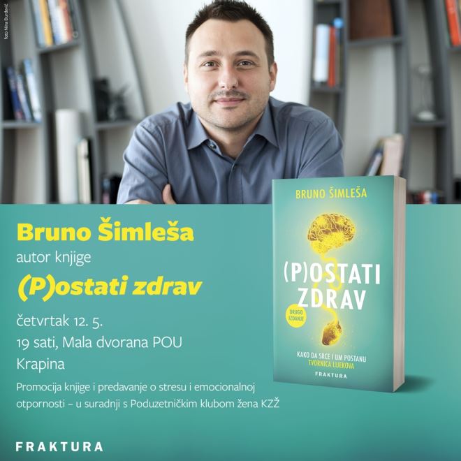 Poduzetnički klub žena Krapinsko-zagorske županije poziva vas na promociju knjige (P)OSTATI ZDRAV Brune Šimleše i na predavanje o stresu i emocionalnoj otpornosti. Holistički pristupajući zdravlju, autor u knjizi naglašava važnost misli, emocija i odnosa na naše fizičko stanje te preispituje uobičajeno shvaćanje koncepta zdravog života. Knjiga (P)ostati zdrav namijenjena je i zdravima i onima koje već muče boljke da shvate kako svojim odnosom prema sebi i životu mogu poboljšati zdravlje. Bogata primjerima iz stvarnog života, kao i nalazima brojnih znanstvenih istraživanja, knjiga želi kreirati most između znanosti i duhovnosti. Naravno, ne trebamo se odreći blagodati klasične medicine kako bismo uživali benefite holističkog pristupa, već ih kombinirati kako bismo povećali šanse za izlječenje i očuvali naše zdravlje.Autor poručuje da su naši srce i um izvanredna tvornica lijekova!