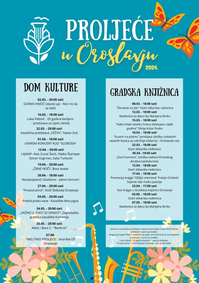 Prvo je u petak, 19.04. kada s početkom u 20 sati u Domu kulture nastupa Boss teatar s kazališnom predstavom 'Črne noči'. Cijena ulaznice je 8 eur i mogu se kupiti u Gradskoj knjižnici Oroslavje te na dan predstave od 18 sati na blagajni Doma kulture.