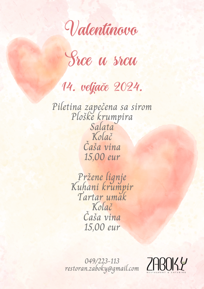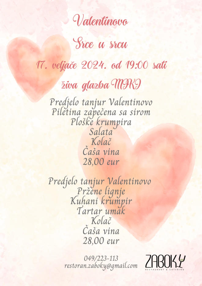 U Restoran Zaboky na valentinovsku se večeru možete izvesti 14. veljače, ali i 17. veljače.