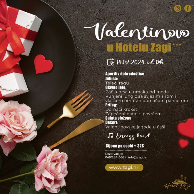 Valentinovo možete proslaviti i u Hotelu Zagi u Oroslavju, 14. veljače, gdje će za vas pripremiti poseban meni, ali glazbu uživo.