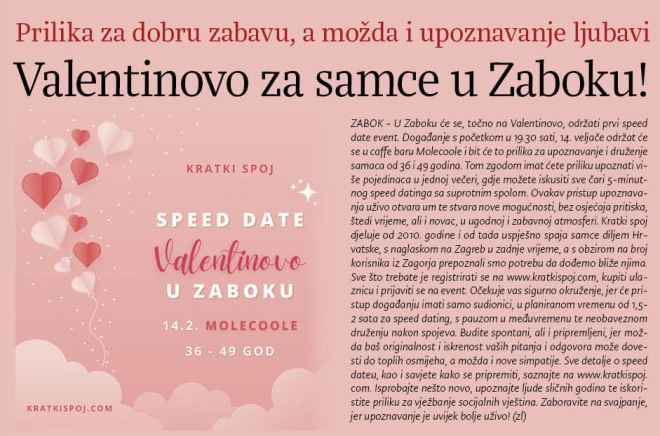 Ukoliko pak još uvijek kraj sebe nemate voljenu osobu, a voljeli biste je pronaći, možda baš za ovo Valentinovo, odvažite se na speed date. Prvi takav event održat će se u Zaboku te je prilika za upoznavanje samaca od 36 do 49 godina.