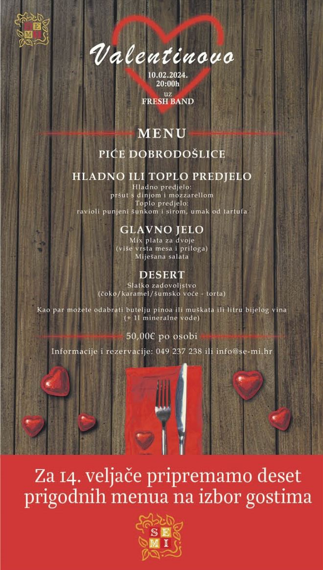 Ove subote, 10. veljače, Valentinovo uz romantičnu večeru i glazbu uživo možete proslaviti i u Restoranu SE-MI. Za 14. veljače su pak pripremili deset prigodnih menija na izbor.