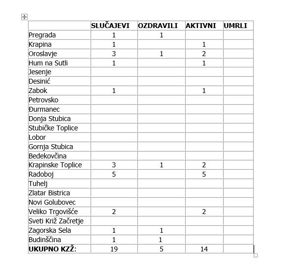Na području Krapinsko - zagorske županije u protekla 24 sata nema evidentiranih novozaraženih osoba, a ozdravile su 2 osobe (1 iz Budinščine i 1 iz Oroslavja). Trenutni broj aktivnih slučajeva zaraze koronavirusom na području Krapinsko - zagorske županije je 14. U samoizolaciji se nalazi 35 osoba, priopćio je Stožer civilne zaštite KZŽ.