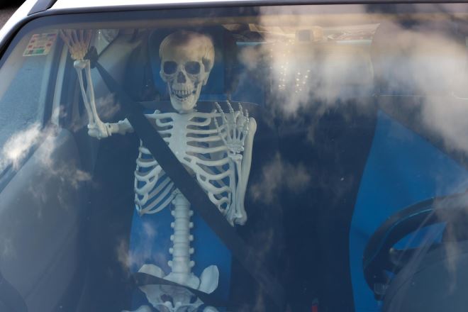 Umjesto uobičajenih namirnica, na suvozačkom mjestu svog automobila odlučio je smjestiti kostur i na taj način simbolično poslao poruku protiv visokih cijena.