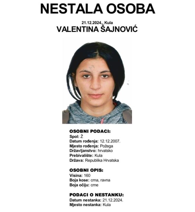 Policija je objavila da je nestala Valentina Šajnović. Djevojka je rođena 12.12.2007., prije nekoliko dana napunila je 17 godina.