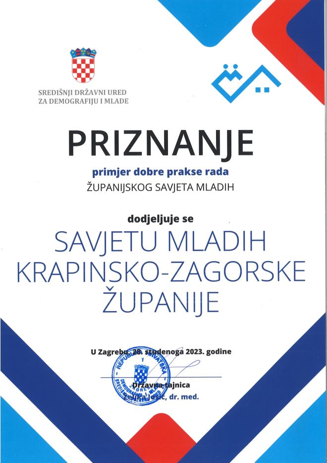 Priznanje za primjer dobre prakse rada županijskoj savjeta mladih u 2023. godini dodijeljeno je Savjetu mladih Krapinsko-zagorske županije te su ga preuzele članice Savjeta Ana Đurkan i Marija Gerbert. Dodjeli je prisustvovala i zamjenica župana Jasna Petek, koja je na odličnom radu čestitala sadašnjem i svim dosadašnjim sazivima županijskog savjeta mladih. „Naš savjet mladih već niz godina ima snažnu ulogu u osmišljavanju i provođenju naših politika za mlade, ali je i odličan suradnik u aktivnostima koji su vezani i uz druga područja te izrazito odgovoran. Na radu u savjetu zahvaljujem svim njegovim članicama i članovima te mogu reći da bih željela da tako aktivan savjet mladih imaju sve županije i sve jedinice lokalne samouprave.“ – poručila je zamjenica župana Petek te kao primjer odličnog projekta mladih istaknula Participativni proračun Krapinsko-zagorske županije za mlade.