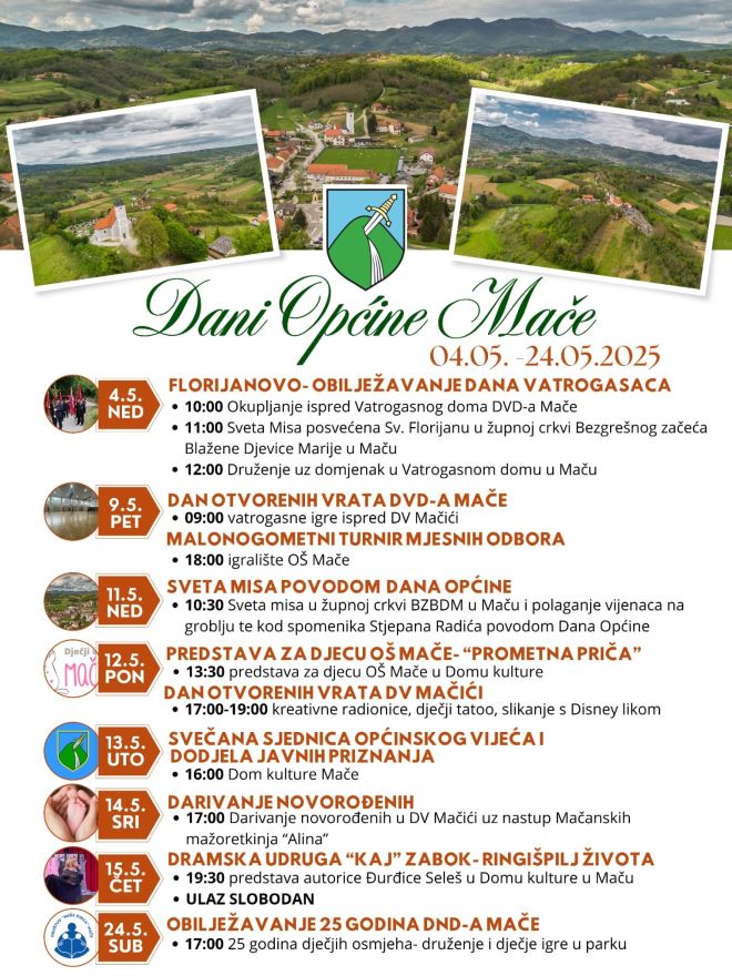 Općina Mače pripremila je višednevni program obilježavanja Dana općine, od 4. do 24. svibnja. Počelo je u nedjelju, proslavom Dana vatrogasaca i svetkovine sv. Florijana. Ovoga petka, 9. svibnja, održat će se Dan otvorenih vrata DVD-a Mače, uz vatrogasne igre za najmlađe od 9 sati ispred DV Mačići, a u 18 počinje tradicionalni malonogometni turnir mjesnih odbora na igralištu OŠ Mače.
