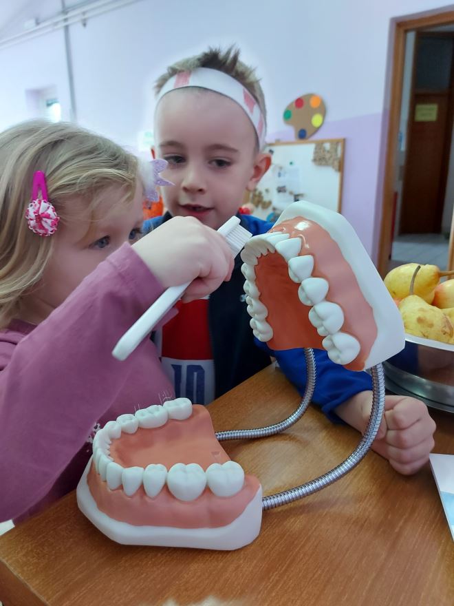 Djeca su se na modelu zubala pobliže upoznala s građom zubi, koliko kojih ima te samim izgledom zubala. Odmah su se sjetili “Grica i Greca.” Naučili su da se četkica drži kao olovka, te se zubi peru kružno 2 puta na dan s malo kalodonta.