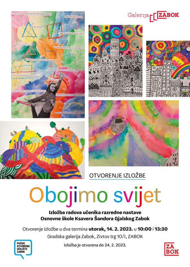 Pučko otvoreno učilište Zabok i Osnovna škola K.Š. Gjalskog Zabok organiziraju u Gradskoj galeriji Zabok izložbu ''Obojimo svijet''. Otvorenje je u utorak, 14. veljače i to u dva termina: u 10:00 i u 13:30 sati.