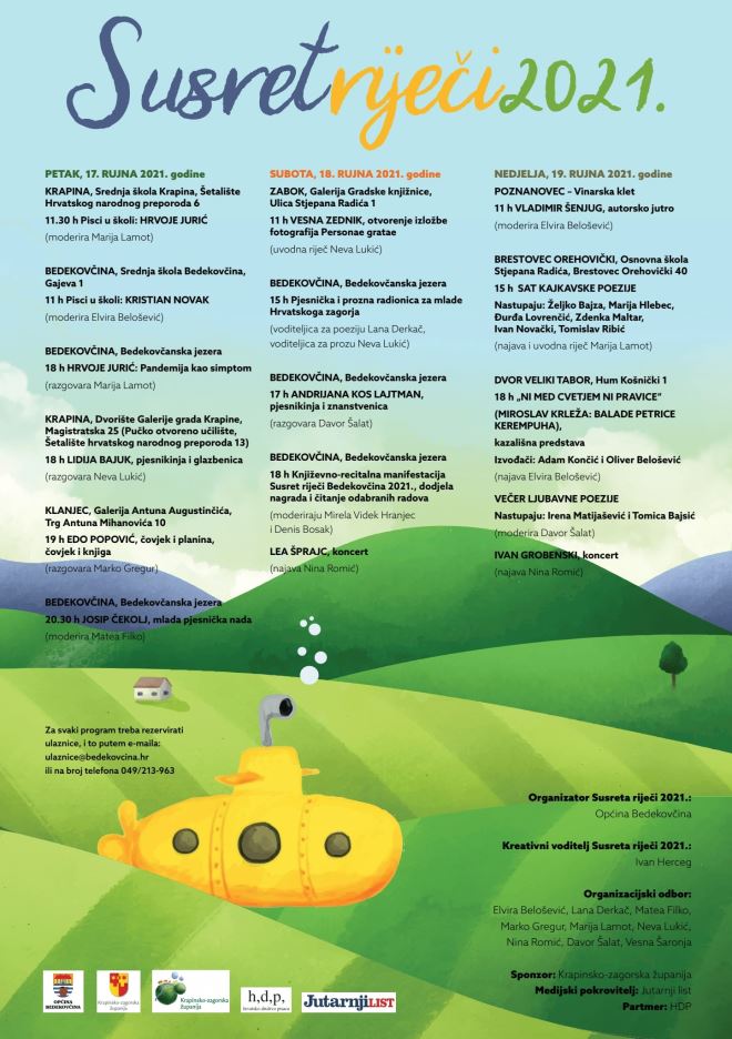 Manifestacija počinje u petak 17. rujna u 11 sati programom Pisci u školi u Srednjoj školi Krapina, gdje će se predstaviti Hrvoje Jurić, te u Srednjoj školi Bedekovčina, gdje će se predstaviti Kristian Novak.