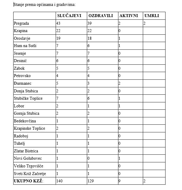 U nastavku je i tablica sa statističkim podacima prema jedinicama lokalne samouprave: o broju stanovnika Krapinsko-zagorske županije koji su bili evidentirani kao zaraženi koronavirusom, podatke o broju stanovnika Krapinsko-zagorske županije koji su evidentirani kao ozdravljeni, podatke o broju preminulih te broju aktivnih slučajeva. U statistiku kontinuirano uključujemo i stanovnike Krapinsko-zagorske županije testirane izvan područja naše županije te osobe koje nisu imale pozitivan nalaz na koronavirus, no sukladno uputama, se zbog epidemiološke anmneze i kliničke slike vode kao pozitivne.