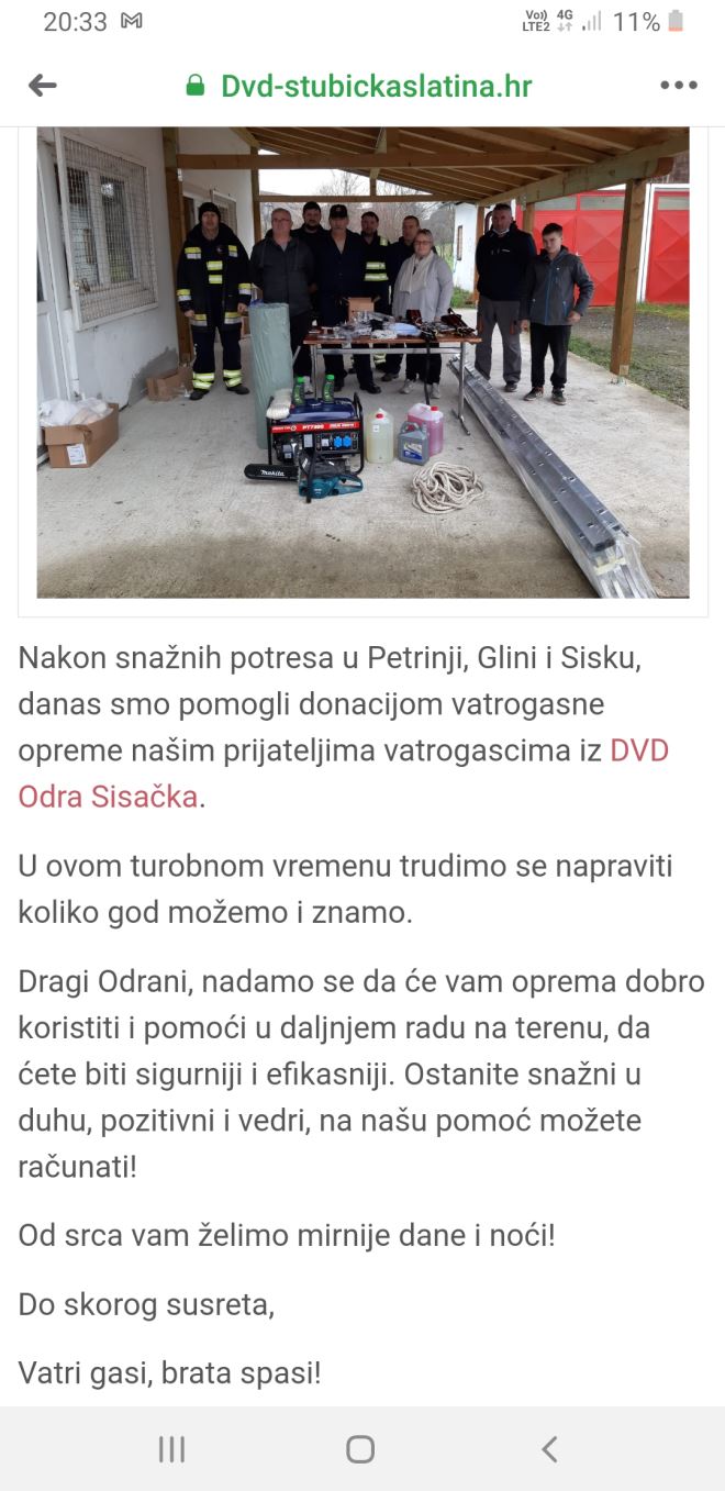 DVD Odra Sisačka u ponedjeljak je primilo vrijednu donaciju od DVD – a Stubička Slatina. - Od srca Vam hvala za svaku i najmanju stvarčicu koju ste nam donirali, sigurni smo da će nam dobro doći u ovoj teškoj situaciji, ali i u idućim intervencijama – napisali su na svojoj Facebook stranici, a pohvalila ih je i zahvalila im se i Marina Šaban, tajnica DVD – a Odra Sisačka. – I naše je mjesto pogođeno razornim potresom koji je pogodio Sisak, Petrinju i Glinu. Prijateljsko smo društvo DVD-a Stubička Slatina, kada su vidjeli što nas je zadesilo, samoinicijativno su kupili vatrogasnu opremu kako bi olakšali našim vatrogascima na terenu. Od srca im hvala na doniranoj opremi, u nevolji se poznaju prijatelji. Zagorje je pokazalo da ima veliko srce – zahvalila je.