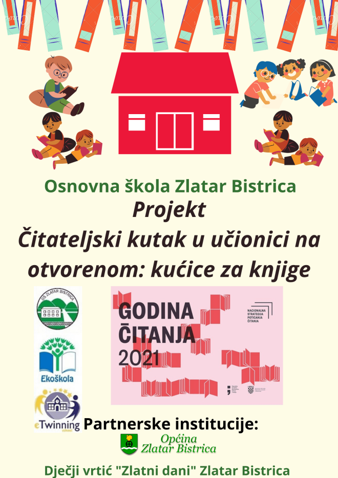 Projektom Čitateljski kutak u učionici na otvorenom: kućice za knjige u OŠ Zlatar Bistrica obilježit će se Godina čitanja 2021. Tijekom projekta koji će se provoditi u šk. god. 2021./2022. učenici će sudjelovati u različitim poticajnim i kreativnim aktivnostima za poticanje čitanja i usvajanje čitateljskih vještina što pridonosi razvoju kulture čitanja i omogućava im da što bolje razviju navike čitanja za zadovoljstvo, za učenje i razumijevanje. Čitanje povećava emotivnu inteligenciju i toleranciju. Puno je različitih emocionalno-spoznajnih, stručnih i korisnih razloga za poticanje čitanje, ali jednako tako je važno čitanje koje razvija samosvijest, samopouzdanje i vrijednosti koje nisu uvijek mjerljive, vidljive, ali su dugoročno važne za kvalitetu života pojedinca i opće dobro zajednice. U OŠ Zlatar Bistrica uređuje se učionica na otvorenom gdje će učenici moći učiti i provoditi slobodno vrijeme tijekom odmora. Jedan od ciljeva projekta je izraditi s učenicima kućicu za čitanje koju bismo postavili u učionicu na otvorenom kako bi im literatura za učenje i čitanje bila uvijek pri ruci. Općina Zlatar Bistrica, a također i Dječji vrtić „Zlatni dani“ će se uključiti u projekat, jer se kućice za knjige, osim u školskom dvorištu, planiraju postaviti i na željezničkoj postaji Zlatar Bistrica, ispred Doma kulture te u dvorištu dječjeg vrtića kako bi čitatelji svih dobnih skupina mogli uživati u druženju s knjigom.