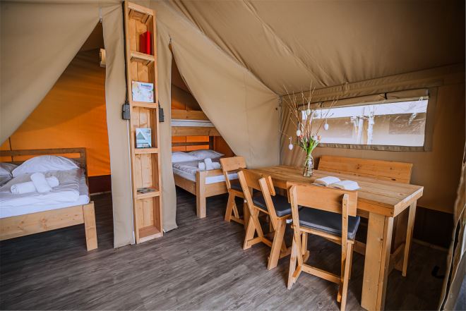 Potpuno novi safari šatori u Termama Tuhelj spajaju udobnost glampinga i prednosti kampiranja. Odmor u zelenilu, svjež zrak i brojne aktivnosti vrhunac su ugodnog boravka u prostranim šatorima koji primaju do 5 osoba. Umjesto da razmišljate o opremi za kampiranje koju ste zaboravili kod kuće, možete se prepustiti potpuno opremljenim šatorima. Šatori imaju odvojene spavaće sobe, opremljenu čajnu kuhinju, svjetiljke i utičnice, verandu i udoban ležaj.
