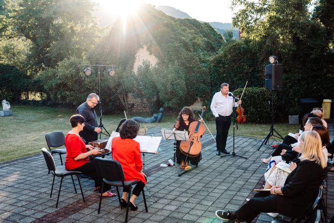 Uvod u svečano otvaranje Salona u dvorištu Galerije grada Krapine bio je izvanredan koncert renomiranog Gudačkog kvarteta Rucner i njihovog glazbenog gosta Petera Soave, svjetski poznatog virtuoza na harmonici i bandoneonu. Kvartet je poznat po svojem raznolikom repertoaru i odstupanju od klasičnih okvira, a repertoarni iskorak prema drugim žanrovima i uspješnu suradnju s Peterom Soave potvrdio je i jučerašnji koncert. Koncert je podržan od strane Ministarstva kulture i medija Republike Hrvatske.