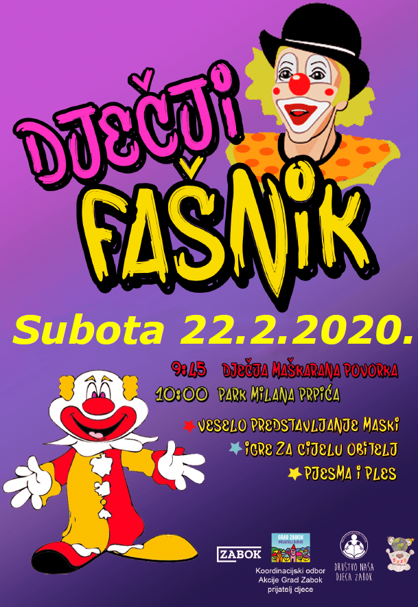 Ove subote održava se tradicionalni Dječji fašnik u Zaboku. U 9:45 kreće dječja maškarana povorka, a maskirani mališani okupit će se u 10 sati u Parku Milana Prpića gdje će se održati veselo predstavljanje maski i igre za cijelu obitelj uz pjesmu i ples.