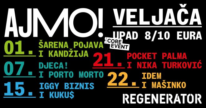 Nakon nezaboravnog prvog koncerta u novoobnovljenom prostoru uz Let 3 i Lika Kolorado u prosincu, klub Regenerator u sklopu Centra urbane kulture Regenerator nastavlja i s bogatim glazbenim programom za veljaču. Deset trenutačno najzanimljivijih imena domaće scene penju se na novu pozornicu Regeneratora u pet zasebnih događanja, a publika u Zaboku uživat će tako u koncertima; Šarena pojava, Kandžija, Djeca!, Porto Morto, Iggy Biznis, Kuku$, Pocket Palma, Nika Turković, IDEM i Mašinko. Koncerti su organizirani u sklopu projekta 'AJMO!' - pilot projekta, rezultata višemjesečne suradnje i planiranja Ureda za izvoz glazbe Hrvatska s Ministarstvom kulture i medija. Cilj projekta je poticanje koncertne aktivnosti u manjim sredinama i podrška domaćim glazbenicima i organizatorima u njihovom radu. Više informacija potražite na web stranici re-generator.hr.
