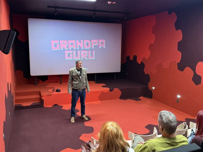 'Grandpa Guru' je portretni dokumentarac koji eklektičnim stilom prikazuje kontinuitet rada benda Kultur Shock, s posebnim naglaskom na zanimljiv život, glazbu i umjetnost njihova pjevača i frontmena Srđana Gine Jevđevića. U filmu pratimo Ginino duhovno putovanje u potrazi za vlastitim identitetom i mjestom u svijetu, nakon izlaska iz sarajevskog ratnog okruženja i dolaska u Seattle, gdje je upoznao Krista Novoselica iz grupe Nirvana i Jellu Biafru iz benda Dead Kennedys koji ga potiču da se nastavi baviti glazbom. Gina progone pitanje pripadnosti i osjećaj rastrganosti između života u Americi, Sarajeva i majke za koju je iznimno vezan. Nakon projekcije filma, održano je druženje i razgovor s ekipom filma, scenaristom i producentom Sanjinom Hasanefendićem i montažerkom Doris Dodik. Projekciji je nazočila publika svih generacija što i nagovješćuje da će program uz svoju jedinstvenost biti namijenjen svim generacijama.