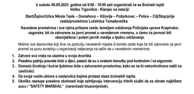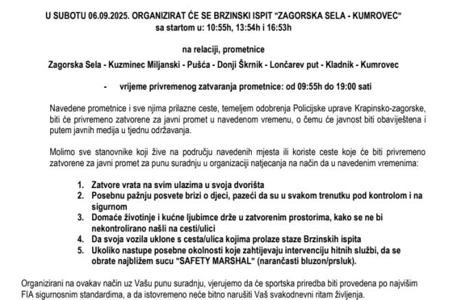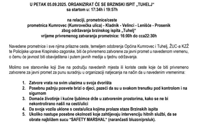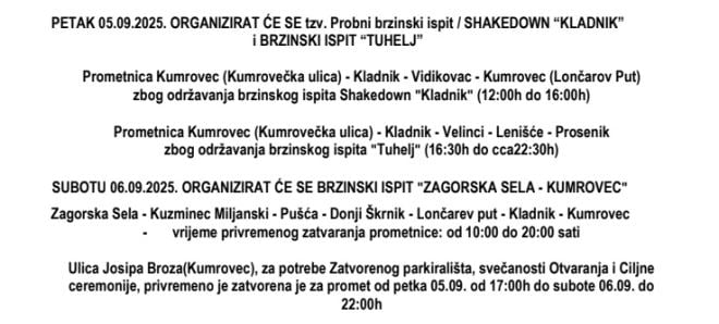 U petak i subotu, 05. i 06.09.2025., održava se sportska međunarodna automobilistička priredba „14. MOTUL RALLY KUMROVEC“, na području Općina Kumrovec, Tuhelj, Veliko Trgovišće, Zagorska Sela te Grad Klanjec - više možete pročitati na www.rally-kumrovec.com