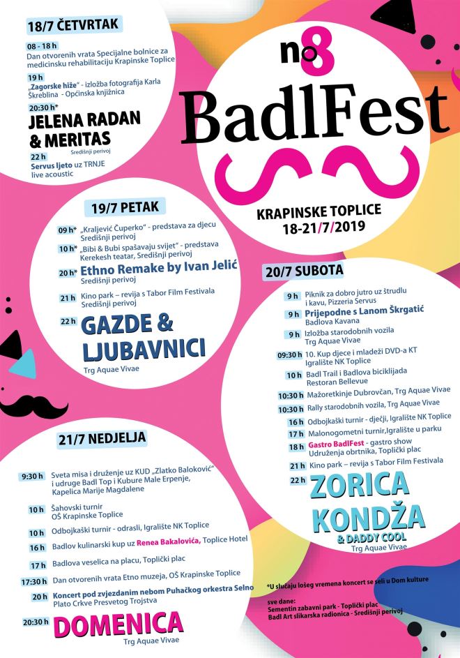 A kaj je zapravo taj BadlFest: Veliki četverodnevni tulum ispod Badlovog brka u kojem se čitavo mjesto, baš kao u Jakobovo vrijeme, pretvara u raspjevani plesni salon počevši od bajkovitog Središnjeg perivoja u parku bolnice, sjenovite Aleje kestena koja vodi do kurije Bellevue,kapelice Marije Magdalene na brijegu s pogledom koji oduzima dah na Krapinske Toplice, pa doživopisnog Trga Aquae Vivae.